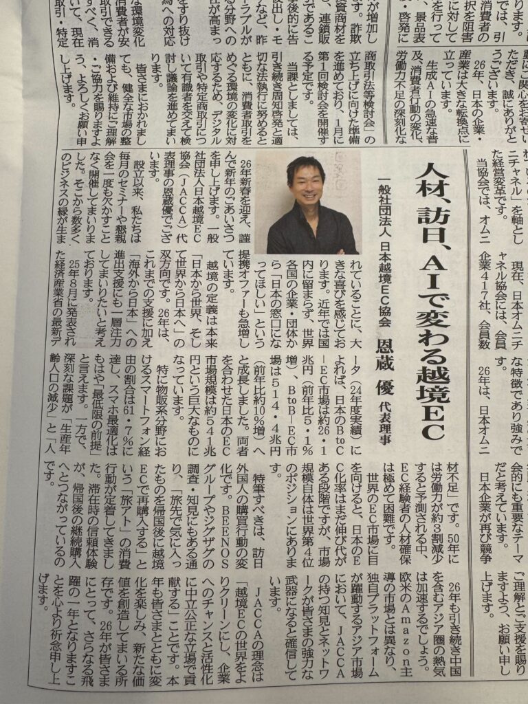 2026年1月に発刊された「日本ネット経済新聞」の新年特大号にて、代表理事の恩蔵 優が年頭所感を寄稿しました。協会設立以来3年連続でのご依頼、大変光栄に思っております。