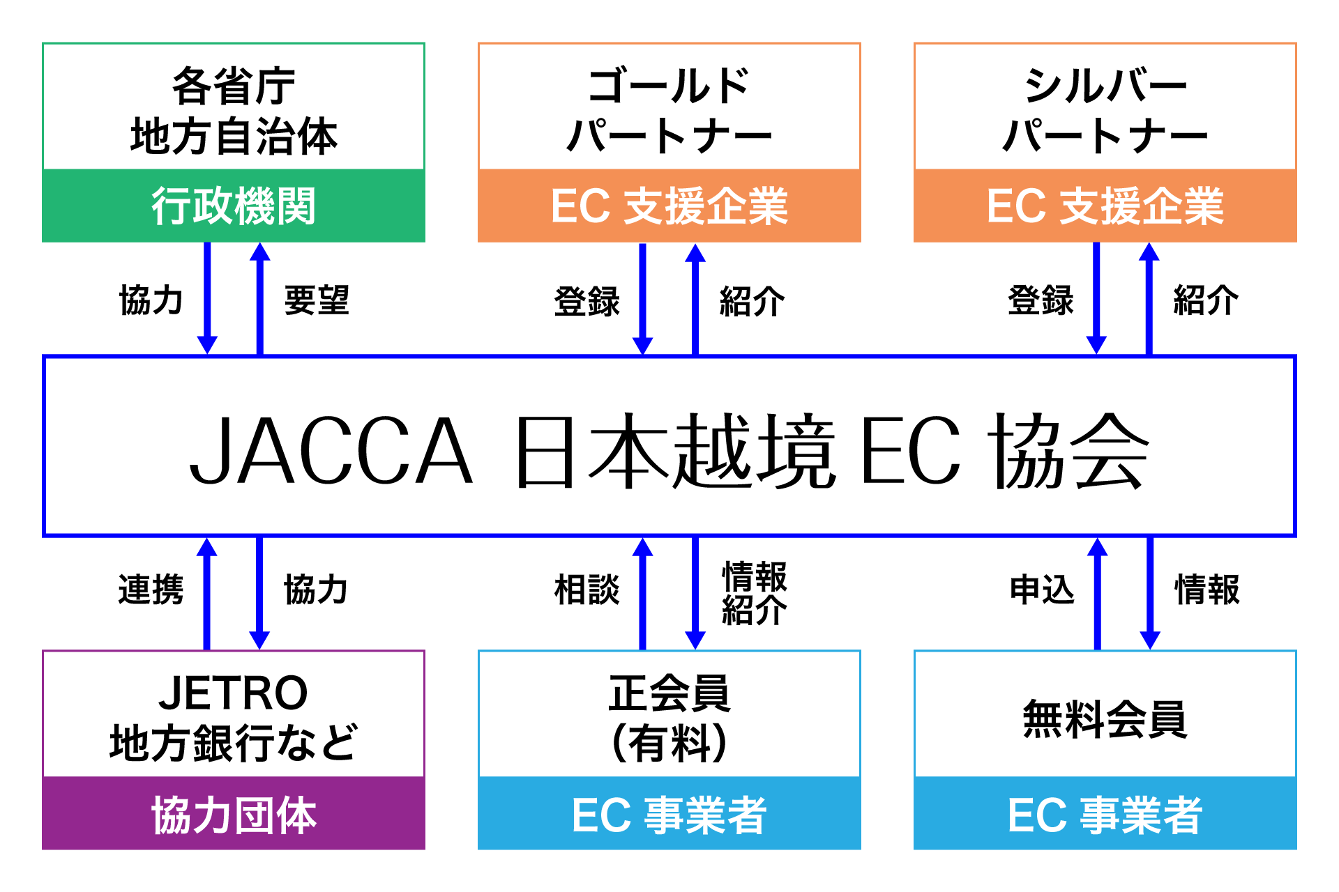 ゴールド/シルバーパートナーであるEC支援企業、 各省庁・地方自治体などの行政機関、JETROや地方銀行などの協力団体、そしてEC事業者(正会員・無料会員)が連携。会員企業には、情報提供、ウェビナー開催、イベント参加、ワークショップ実施、メールマガジンやウェビナーでの情報発信、EC_EXPO(毎年)でのマッチング機会など、多様な接点を提供します。