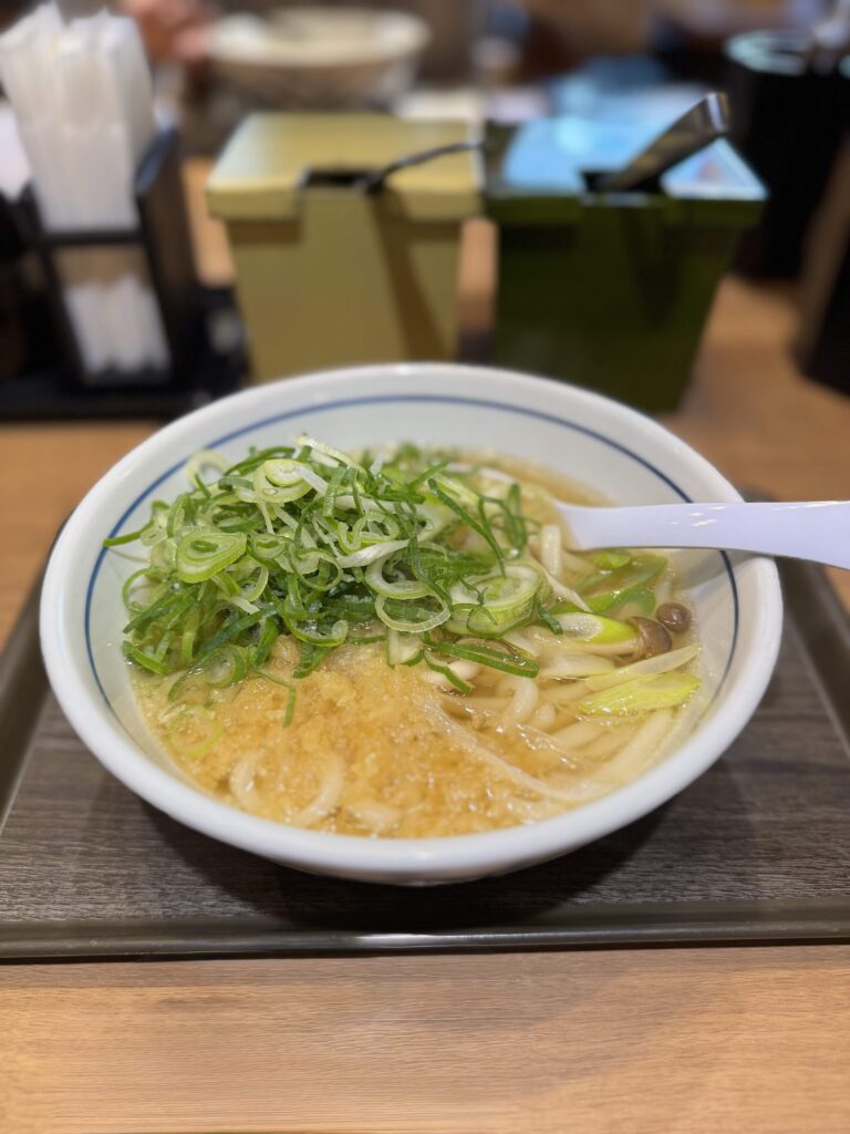 九州のうどんはコシがないですが、麺が透き通っててそれなりに歯応えもあって美味しいんですよ。ネギや天かすが入れ放題なのも嬉しい笑