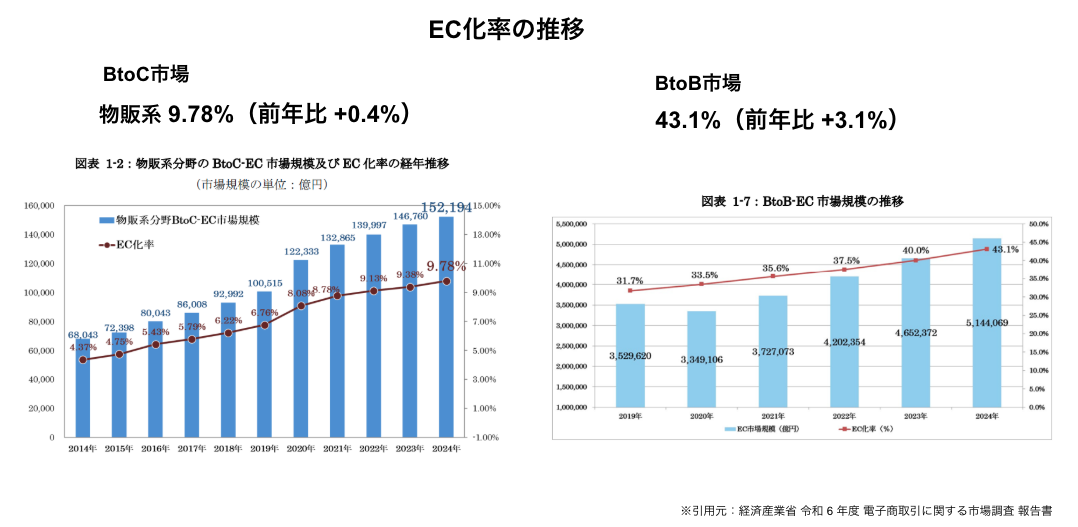 そして気になる「EC化率」は、BtoC市場で9.78%、BtoB市場で43.1%まで成長してきました。