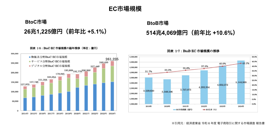 かたや「BtoB-EC規模」は514.4兆円。前年は約465兆円なので約50兆円の増加。BtoBは10%を超える成長率です。両市場を合わせると「日本のEC市場は約541兆円」にまで成長しました。ちなみに、主に我々が関わっている物販系分野のBtoC-EC市場規模は、前年の約14.7兆円から5,400億円強増加し、約15.2兆円でした。