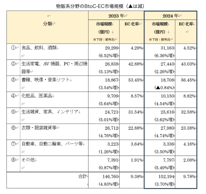 「食品、飲料、酒類」→3兆1,163億円(EC化率4.52%)