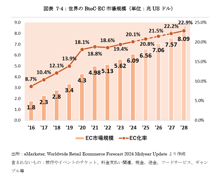 今後も市場規模の拡大とEC化率の上昇が予想されており、2028年には8.09兆US ドル、EC化率は22.9%まで上昇すると予測されています。