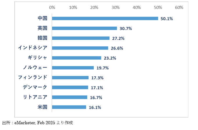 トップは中国で50.1%、続いて英国30.7%、以下韓国27.2%、インドネシア26.6%、ギリシャ23.2%、ノルウェー19.7%と続き、日本は第13位で14.17%
