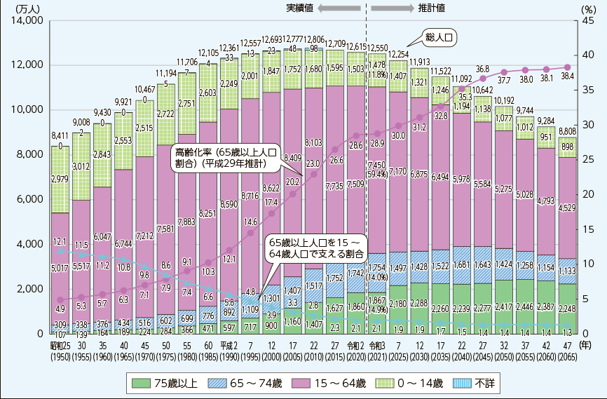 既に実感されている方も多いかもしれませんが、少子高齢化の進行により、我が国の生産年齢人口(15~64歳)は1995年をピークに減少しており、2050年には5,275万人(2021年から29.2%減)に減少すると見込まれています。この減少により、労働力の不足、国内需要の減少による経済規模の縮小など様々な社会的・経済的課題の深刻化がすでに起きています。