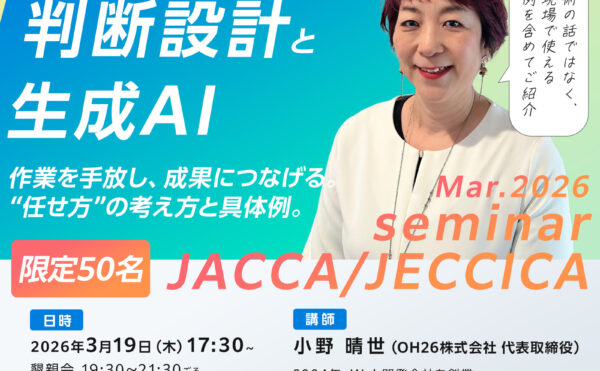 NEW 2026年2月20日イベント情報JACCA広報 JACCA&JECCICA共催|セミナー/懇親会:EC現場のための「判断設計と生成AI」― 作業を手放し、成果につなげる“任せ方”の考え方と具体例EC現場のための「判断設計と生成AI」 作業を手放し、成果につなげる。“任せ方”の考え方と具体例 生成AIを「文章を作る道具」から、業務を前に進める仕組みへ変えるために、なにをどのように考えていくのか?非エンジニアに向け […]