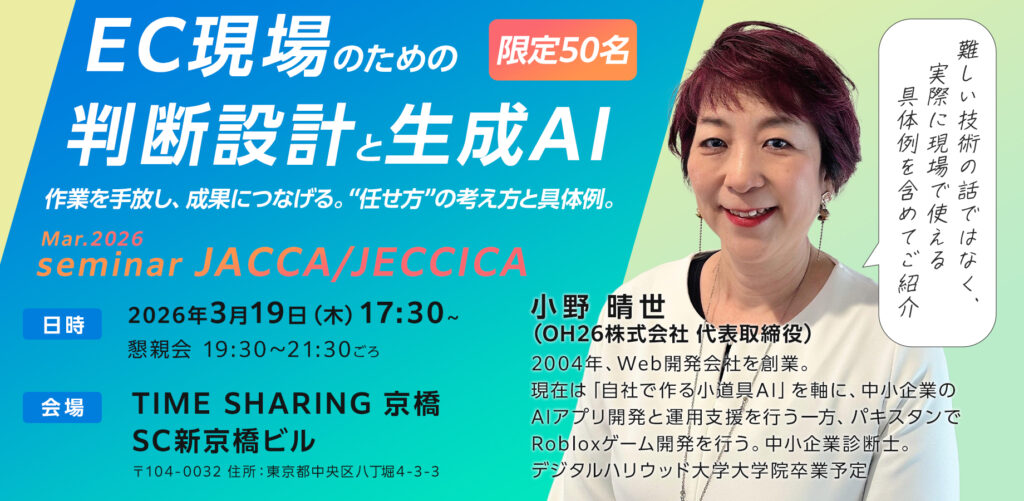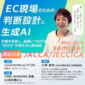 JACCA&JECCICA共催|セミナー/懇親会:EC現場のための「判断設計と生成AI」― 作業を手放し、成果につなげる“任せ方”の考え方と具体例